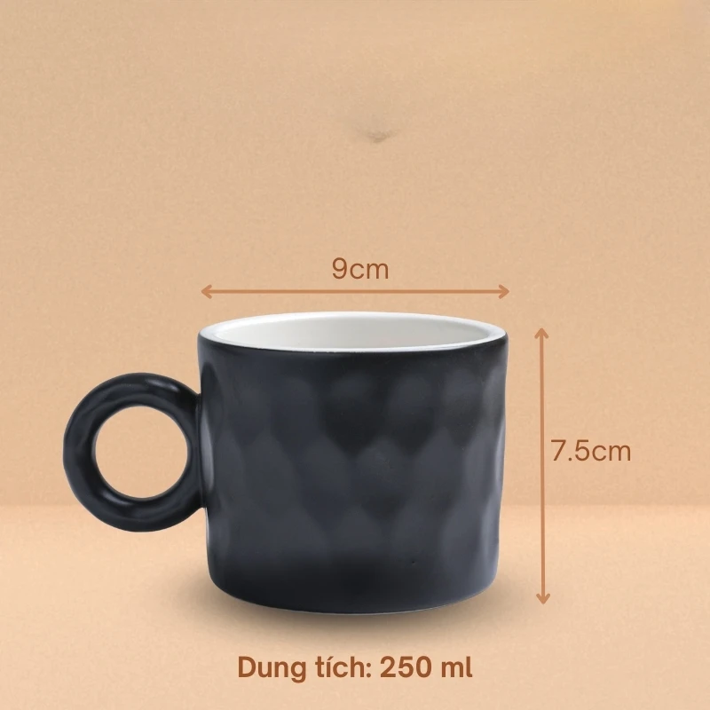 Kích thước cốc cao 8cm, đường kính miệng 10cm rất cân đối, tạo cảm giác thoải mái khi uống. Kết cấu chắc chắn, chịu được va chạm nhẹ trong sinh hoạt hàng ngày. Dung tích 250ml vừa đủ cho một phần cà phê, trà hoặc các loại nước giải khát hàng ngày.
